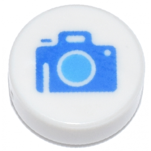 LEGO csempe 1×1 kerek kék színű fényképezőgép mintával, fehér (109054) --- Debrecenben raktáron!