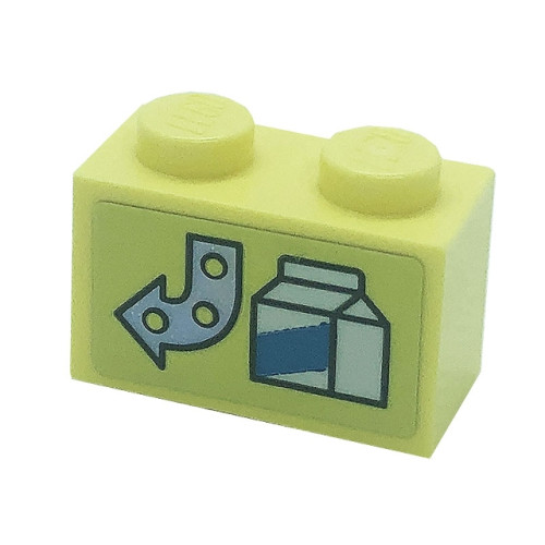 LEGO kocka 1x2 nyíl és italos doboz mintával (matrica), világossárga (3004pb249)